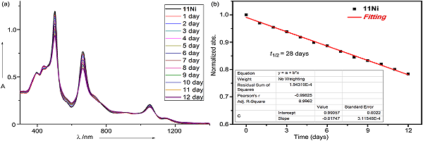 图2. (a)化合物11Ni的紫外可见吸收光谱随时间变化谱图;(b)化合物11Ni在502 nm处的吸光度随时间变化的曲线和半衰期估值约为28天。