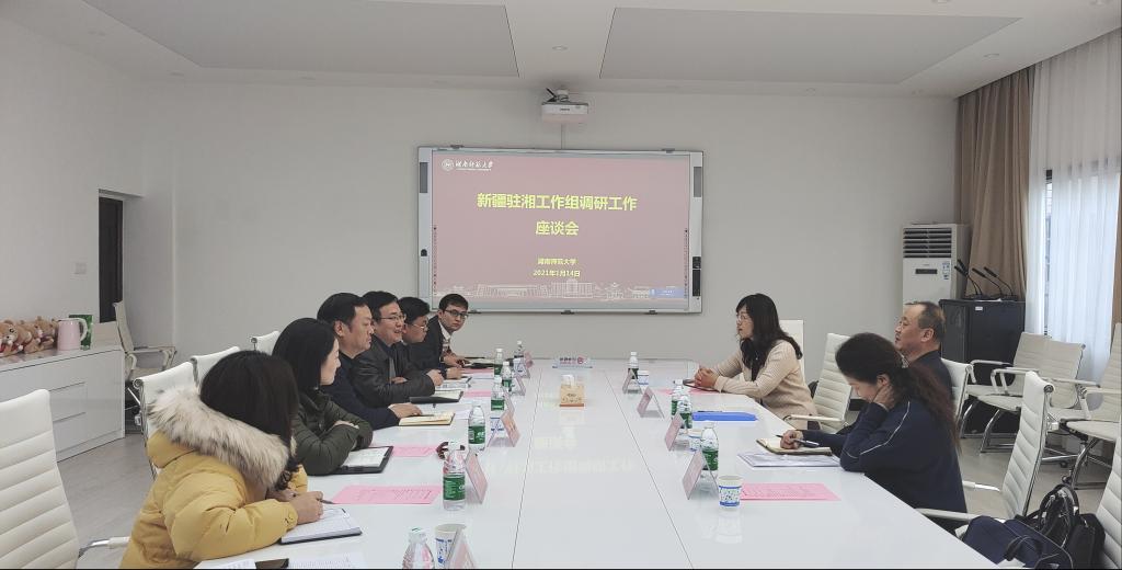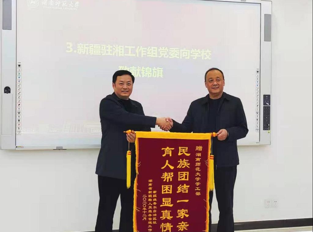 (供稿 学工部)1月14日下午,新疆驻湖南省工作组党委书记、组长肖志东一行来校调研并赠送锦旗。副校长王辉出席会议并讲话,会议由学生工作部(处)部(长)向发意主持。