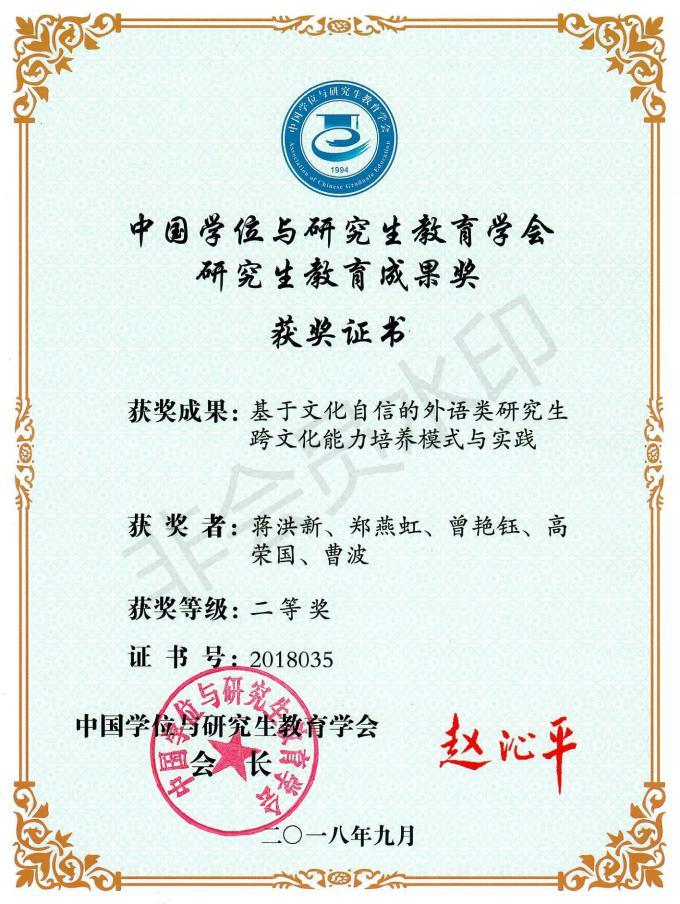 蒋洪新教授领衔的《基于文化自信的外国语类研究生跨文化能力培养模式与实践》获评第三届中国学位与研究生教育学会研究生教育成果二等奖