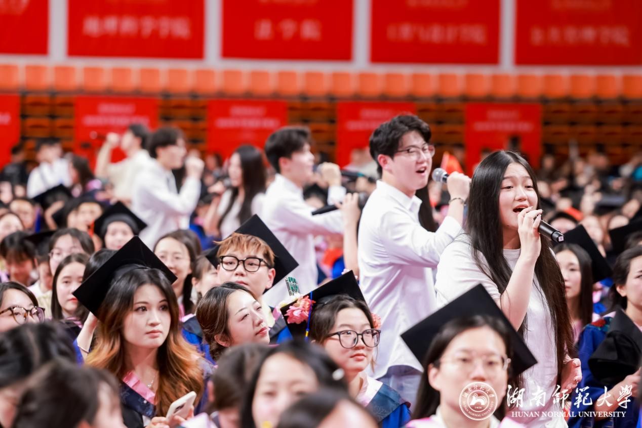 上午九点,伴随着雄壮的国歌声和激昂的校歌声,五星红旗和湖南师范大学校旗冉冉升起,2025届本科生毕业典礼暨学位授予仪式正式开始。