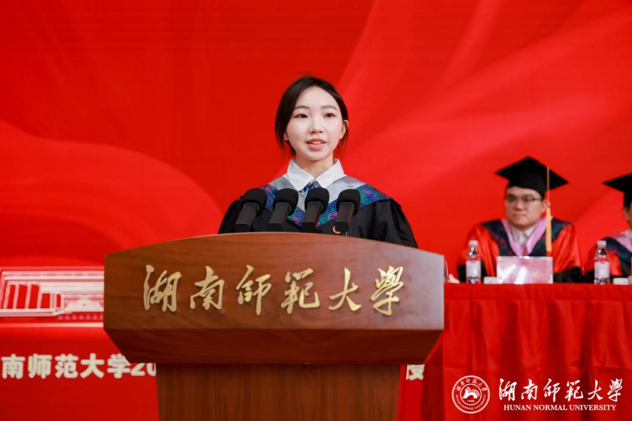 世承书院本科毕业生朱唐佳瑶作为本科毕业生代表发言,她深情讲述了自己在岳麓山下的求学时光,表达了对母校、对老师的感激与不舍之情,并呼吁同学们永远争做具有“仁爱精勤”底色的湖南师大人。