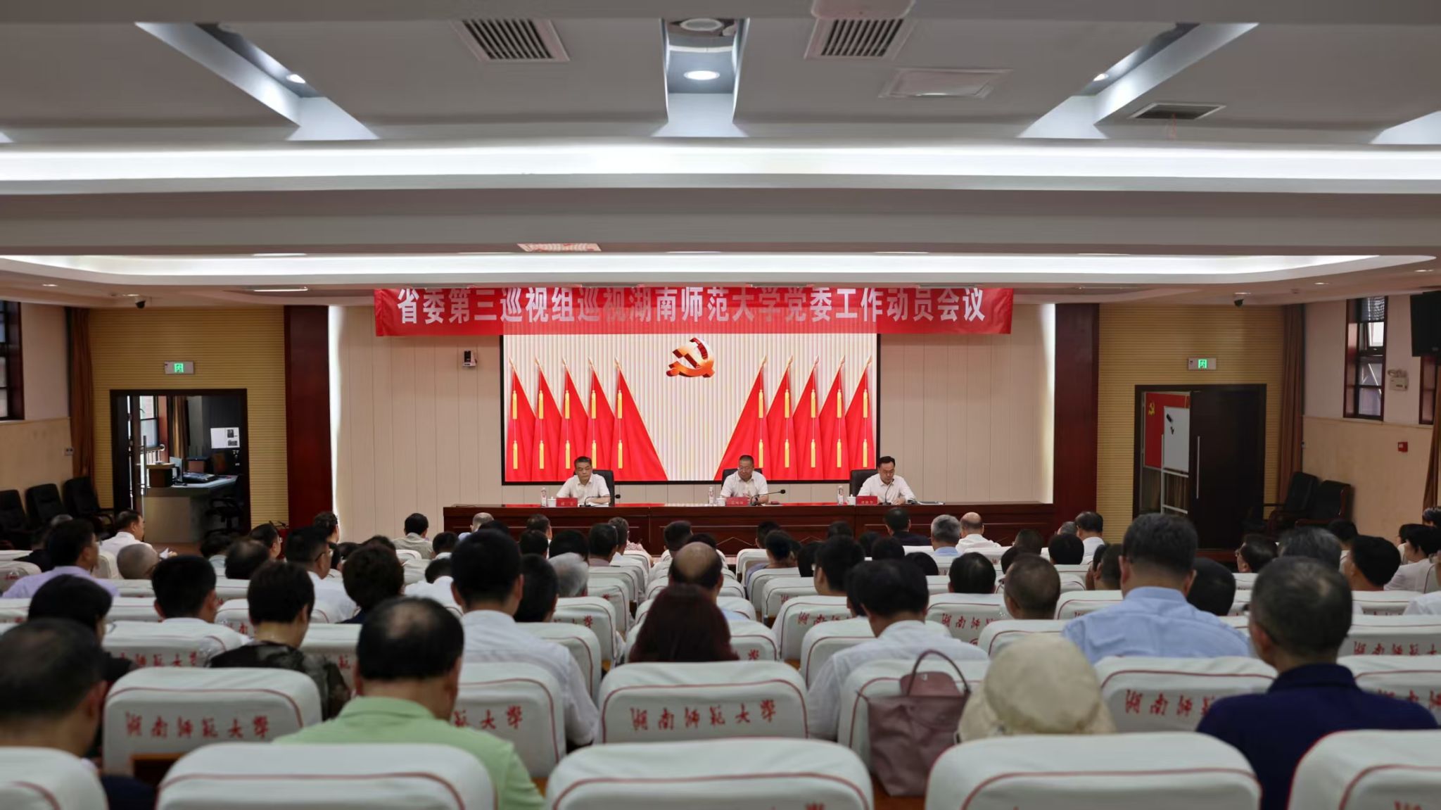 根据省委关于巡视工作的统一部署,2025年9月16日下午,省委第三巡视组巡视湖南师范大学党委工作动员会召开。会前,省委第三巡视组组长艾可知主持召开与湖南师范大学党委副书记、校长刘仲华的见面沟通会,通报了巡视工作有关安排。会上,艾可知就即将开展的巡视工作作了动员讲话。刘仲华主持会议并作表态讲话。