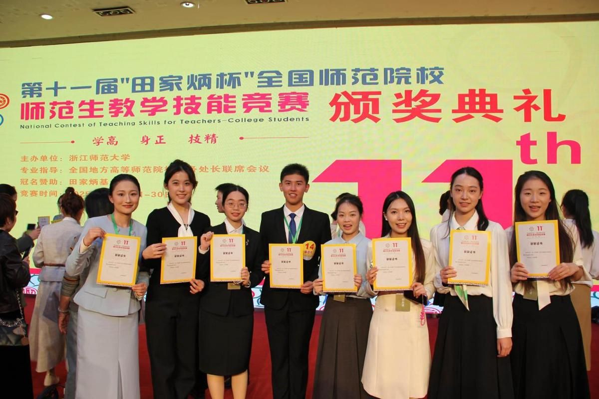 (通讯员 刘彩春 莫雯)11月28日至30日,第十一届“田家炳杯”全国师范院校师范生教学技能竞赛决赛在浙江师范大学举行。我校13名参赛学子全部获奖,共获得一等奖6项、二等奖2项、三等奖5项,其中莫雯获汉语言文学组一等奖,方浩轩获英语组一等奖,贺宇轩获生物科学组一等奖,李璐蓉获思想政治教育组一等奖,周妍获地理科学组一等奖,刘逸轩获体艺组(美术)一等奖。一等奖获奖数量在全国参赛高校中排名并列第三。