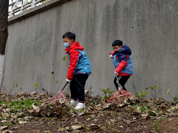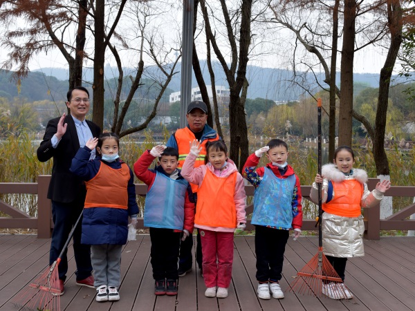 半路上,正在湖边清扫垃圾的环卫工人被孩子们团团围住,大家向环卫工人守护我们的卫生表示感谢,并接过他手中的耙子,七手八脚的帮忙打扫落叶。