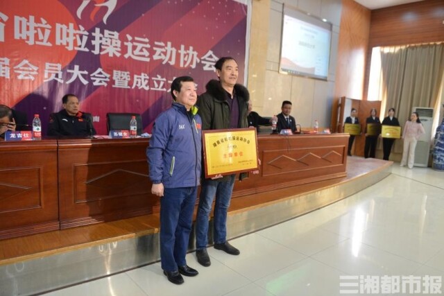 (湖南省体育总会专职副主席冯湘江为省啦啦操运动协会主席单位授牌。)