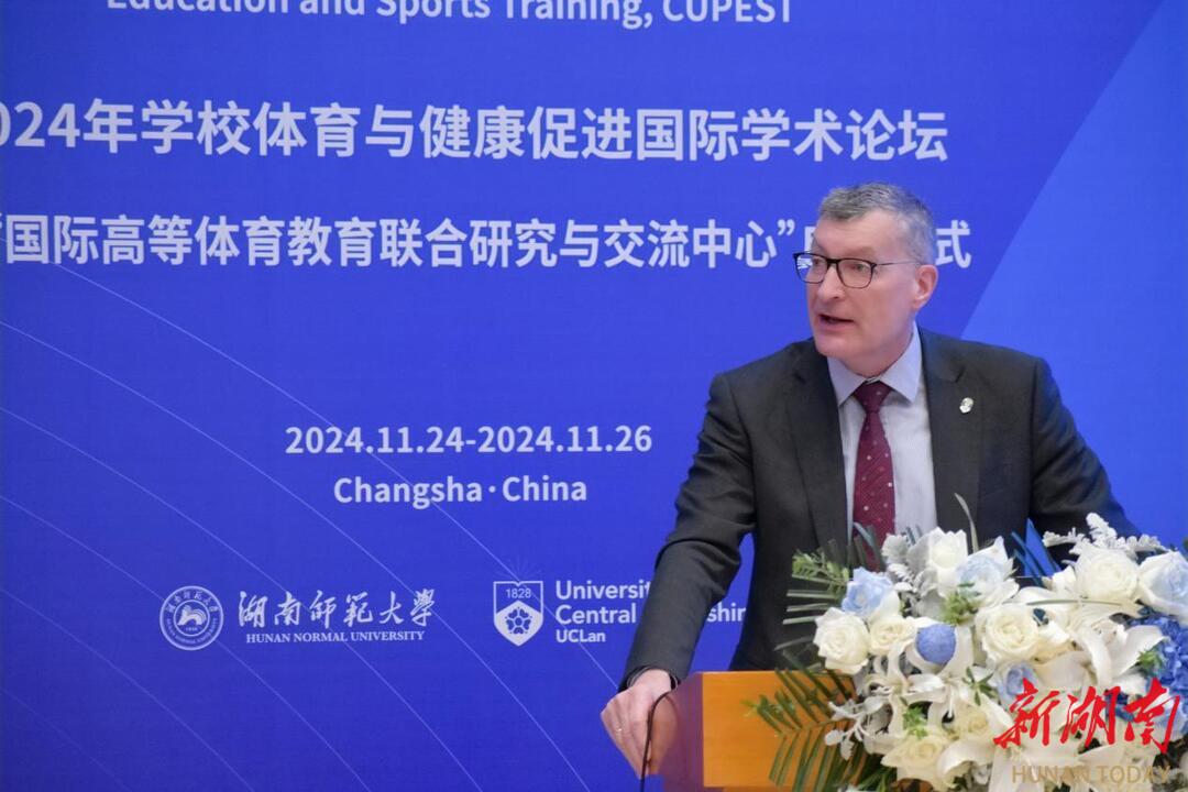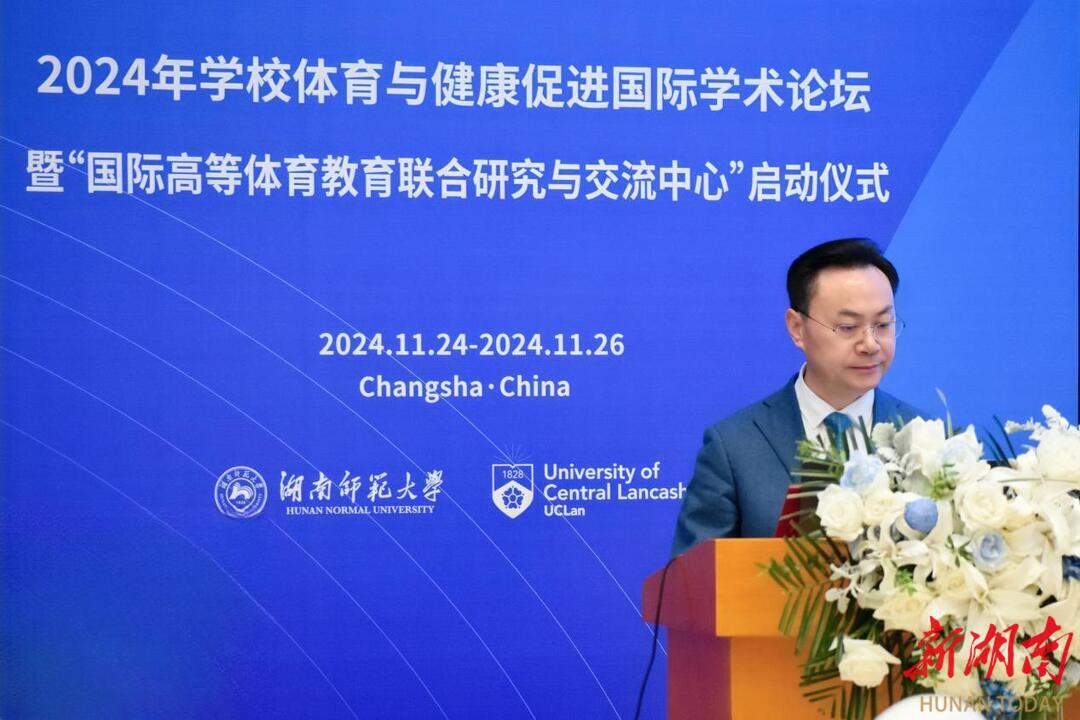 新湖南客户端11月25日讯(通讯员 孙意远 胡雨雯)11月25日上午,由湖南师范大学与英国中央兰开夏大学联合主办的2024年学校体育与健康促进国际学术论坛暨“国际高等体育教育联合研究与交流中心”启动仪式在该校逸夫图书馆报告厅举行。国家体育总局科教司副司长隆胜军、英国中央兰开夏大学校长格雷厄姆·鲍德温、湖南师范大学校长刘仲华等参加了开幕式。