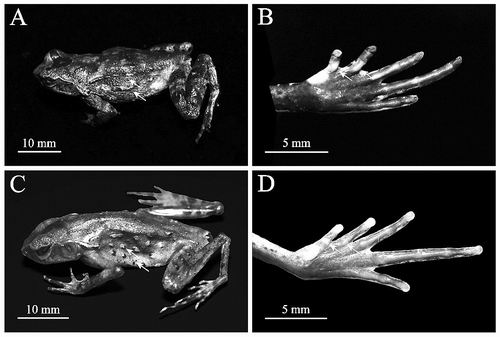 ▲都庞岭角蟾(A、B)与云开角蟾(C、D)的侧面和趾基部关节下瘤对比。受访者供图
