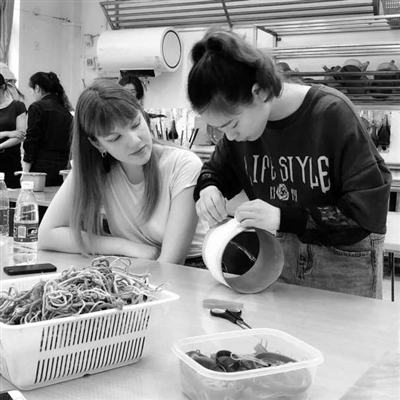 湖南师范大学美术学院学生(右)与法国大学生共同参与设计工作坊。 湖南师范大学供图