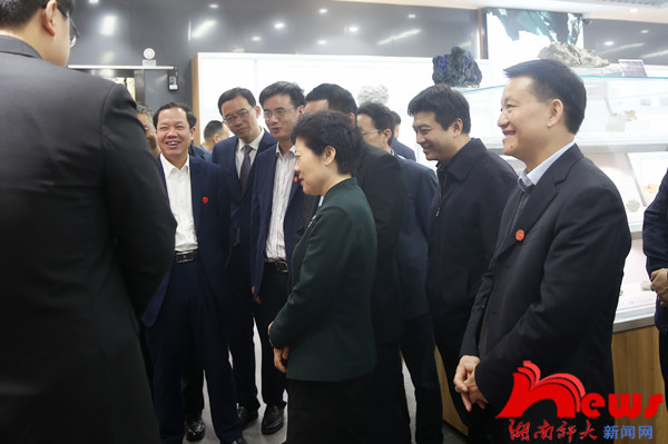仪式前,吴桂英考察了我校地学博物馆,对我校相关学科的建设和办学成就表示认可。她充分肯定了我校在岳麓山大学科技城建设工作中的成绩,鼓励大家要勇于攻克“卡脖子”的关键核心技术,加强产学研深度融合,促进科技成果转化。她指出,当前大科城建设面临的机遇前所未有、发展任务繁重、潜力空间巨大,要进一步加强校地合作,通过相互支持实现共同发展,取得更多扎实的合作成果,共同推动大科城建设。