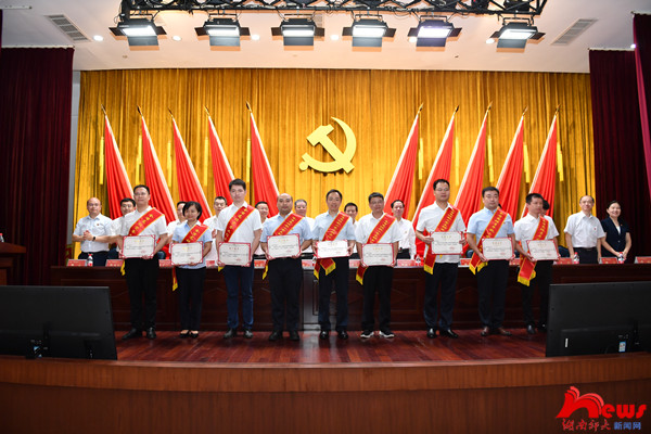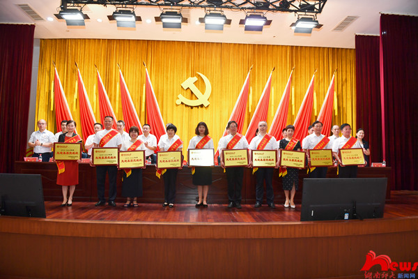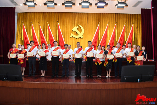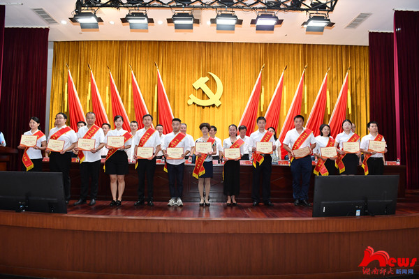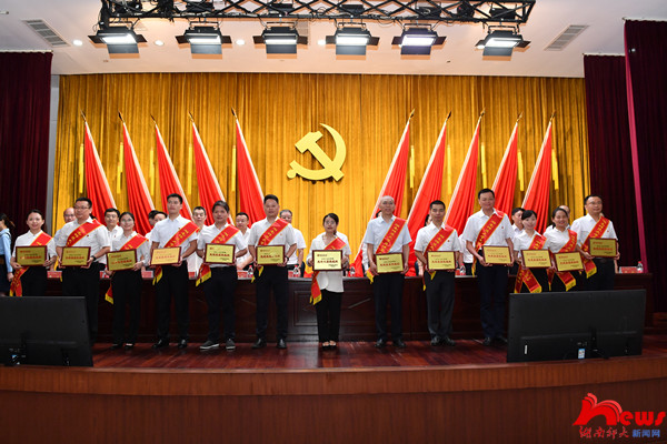 校纪委书记姚春梅宣读2019年以来学校省级以上党建荣誉获得者名单。全国先进基层党组织教育科学学院党委,湖南省优秀共产党员肖北庚,以及一批入选省级“对标争先”建设计划的集体和个人等受到表彰。
