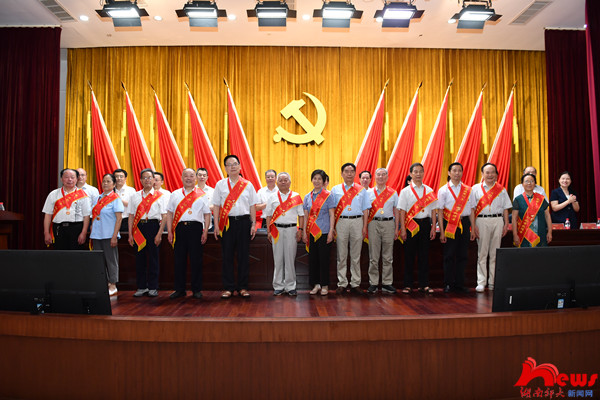 获得“光荣在党50年”纪念章的老党员代表,以及优秀个人和先进集体领奖代表身着盛装、肩披绶带,接受在主席台就座的全体校党委委员颁章颁奖,现场气氛庄重而热烈。
