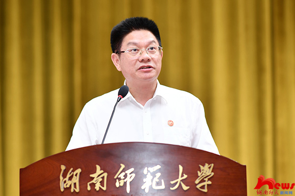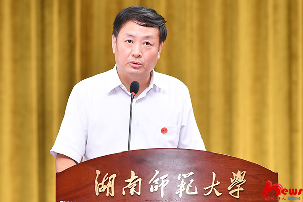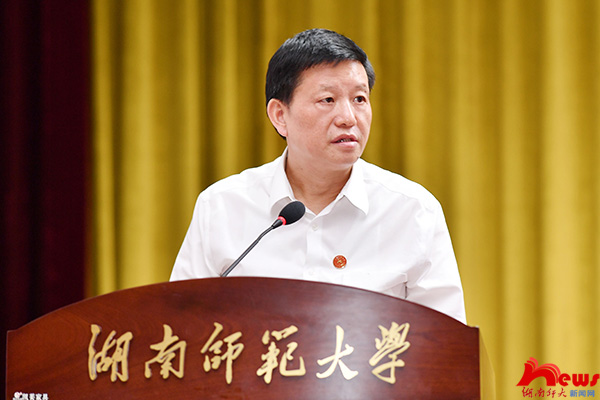 蒋洪新对一直以来辛勤工作的师生员工表示衷心感谢。他着重强调了五个方面的工作:一是坚持正确办学方向。要坚持以习近平新时代中国特色社会主义思想为指导,深入学习贯彻习近平总书记“七一”重要讲话精神和关于加强高校党建工作的重要论述,贯彻落实《中国共产党普通高等学校基层组织工作条例》,切实加强思想、组织和作风建设,在“学深”上下功夫、在“做实”上下功夫、在“见效”上下功夫,确保党的教育方针在学校全面贯彻落实。二是完善顶层设计。要进一步围绕高水平师范大学建设,将五个师大建设任务细化分解,化作具体行动方案,在发展定位上处理好师范特色与综合发展的关系,在学科专业上处理好传统优势与新兴交叉的关系,在功能布局上处理好物理空间与资源整合的关系。三是聚焦内涵建设。要推动内涵式高质量发展,不断优化适应新发展格局需求的教育结构、学科专业结构、人才培养结构,实现更高质量立德树人、更高水平创新转化、更高效益对外开放,以高质量发展服务国家经济社会发展。四是优化内部治理。要切实加强与改进党对学校事业的全面领导,将坚持党委领导下的校长负责制作为重中之重,建立健全现代大学治理体制机制,加强干部队伍管理,不断健全和完善现代大学制度体系。五是坚持文化引领。要把伟大建党精神与传承和弘扬“仁爱精勤”的师大精神统一起来,进一步优化校园文化景观、培育校园文化品牌、加强精神文化建设,形成推动学校发展的强大动力。