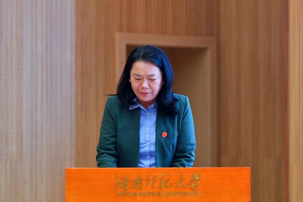 获奖个人和单位代表上台发言。“全国三八红旗集体湖南师范大学外国语学院工作室”负责人、湖南省五一劳动奖章获得者曾艳钰教授汇报了外国语学院工作室2021年的工作与成绩。“文明家庭”代表、教育科学学院常思亮教授表示将尽心尽力做实事、做好事,为学校的进一步发展作贡献。