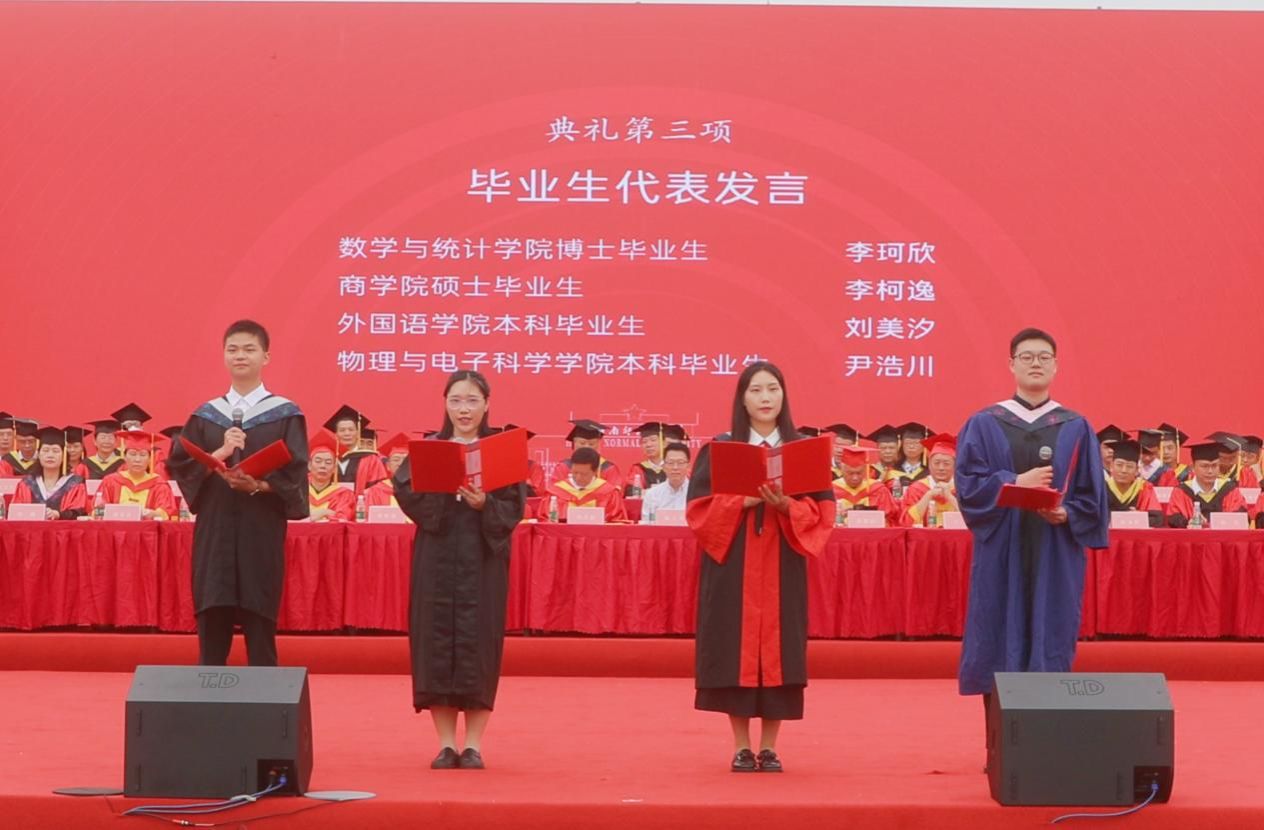 数学与统计学院博士生李珂欣、商学院研究生李柯逸、外国语学院本科生刘美汐、物理与电子科学学院本科生尹浩川作为毕业生代表发言。他们回顾了在校求学和成长的经历,表达了对母校、对老师、对同学的感激与不舍之情以及争做栋梁、报效祖国的决心。