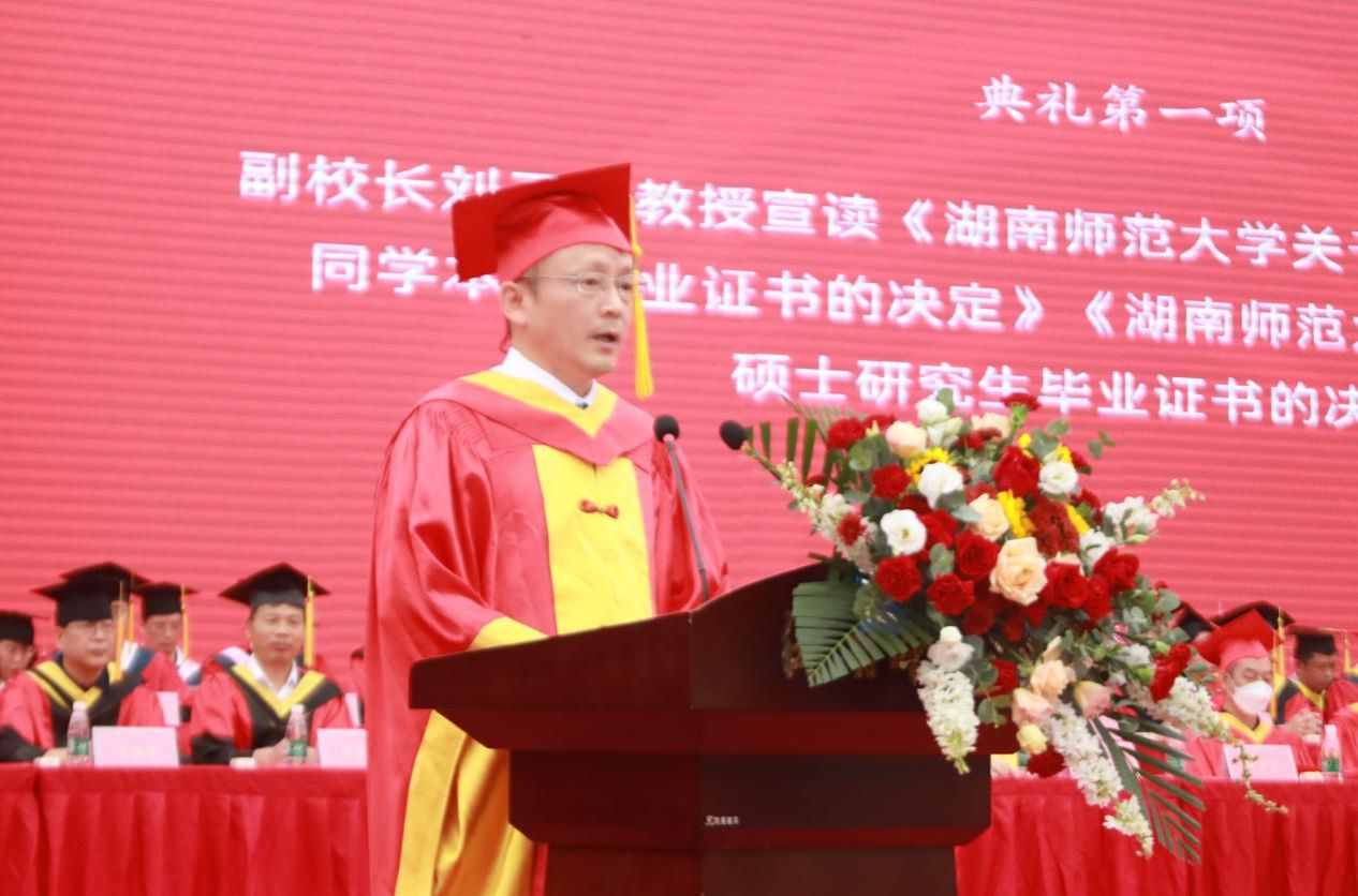 副校长蒋新苗教授宣读《湖南师范大学关于2023年6月授予博士、硕士、学士学位的决定》。