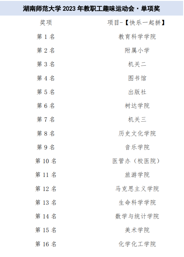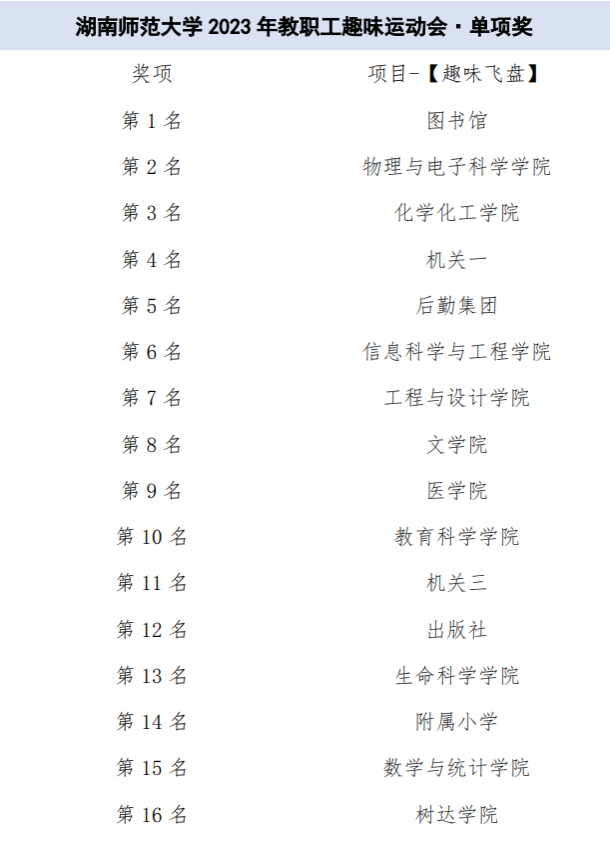 本次活动吸引了30个部门工会代表队千余名教职工踊跃参赛。比赛四个项目设单项奖1-16名,团体奖1-8名。经过激烈角逐,体育学院赢得“携手并进”项目的胜利;图书馆取得“趣味飞盘”的第一名;地理科学学院摘得“万众一心”的桂冠;教育科学学院获得“快乐一起拼”的冠军。图书馆、附属小学、机关三、教育科学学院、出版社、化学化工学院、树达学院、后勤集团获团体奖。
