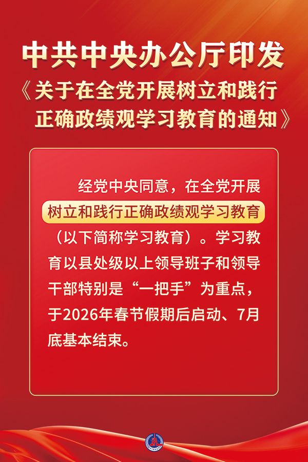 近日,中共中央办公厅印发《关于在全党开展树立和践行正确政绩观学习教育的通知》。本次学习教育以立党为公、为民造福、科学决策、真抓实干为总要求,旨在教育引导各级党组织和党员、干部坚持实事求是、求真务实,为人民出政绩、以实干出政绩。